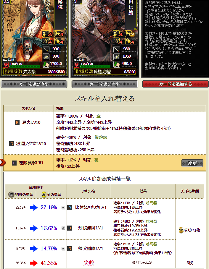 この3枠目に付けるスキルも、候補が槍隊襲撃が出るようにすれば、邪魔な候補が消えて、烈侵滅国と、煉火廻陣だけになってよいと思いませんか?・・・