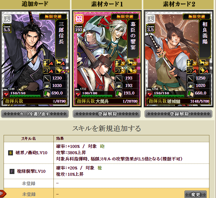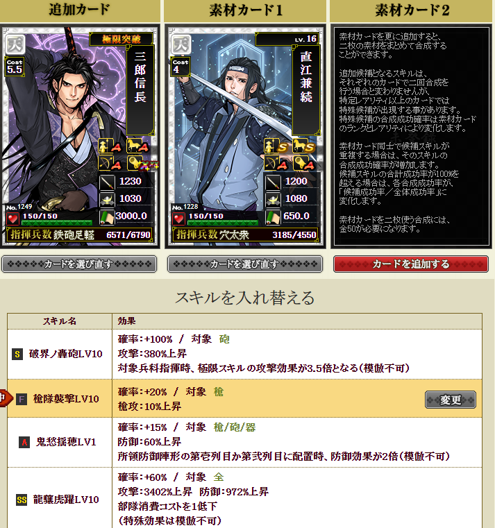 卓越2回武将の2名に特スキルが1個ずつ付いてるのを入れ替えられれば、もう少し火力がアップできそうです