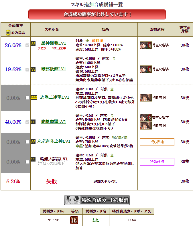 ただし、狙いの閻魔(卓越発動率アップ25%)は成功確率70%・・・月詠(自軍卓越発動率アップ15%)は合流時は重複2回までなので、もう片方の部隊にすでに2個付いている関係で、合流時は意味がない・・・