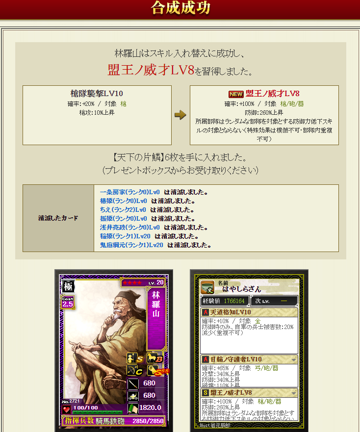 林さんを防御で使用しているのですが、自マネが付いておらず、発動率が厳しいので、別武将がマネている状態・・・つまり部隊長にしないといけないため、どうにも使いづらい・・・部隊長はもっと強い方にしてマネマネしたいので、自マネ狙いの合成をしてみます・・・
