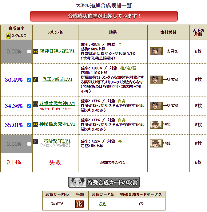 素材は、2枚ある新シクレ武将一条さんのCが八重・・・そして、B候補の盟王ノ威才「防御力低下を防ぐ」というスキルもよさそうなので狙ってみようかと・・・