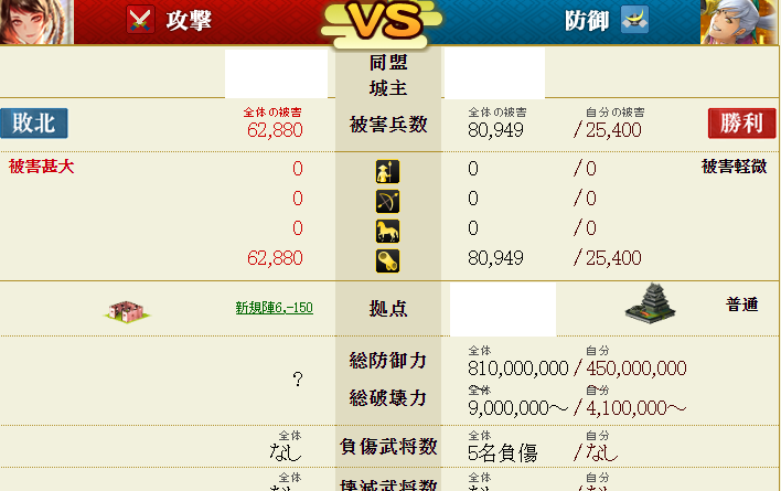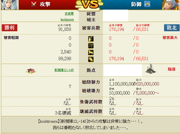 前回の織田家攻撃戦で、とある同盟のAさんとBさん(Cさんもいたはずだけど防衛戦では凸って来ませんでした)に激しい攻撃を受け、こちらも全2名でAさんに合流攻撃を仕掛けるも落としきれず・・・最終的に私の出城は陥落という結果になりました・・・
