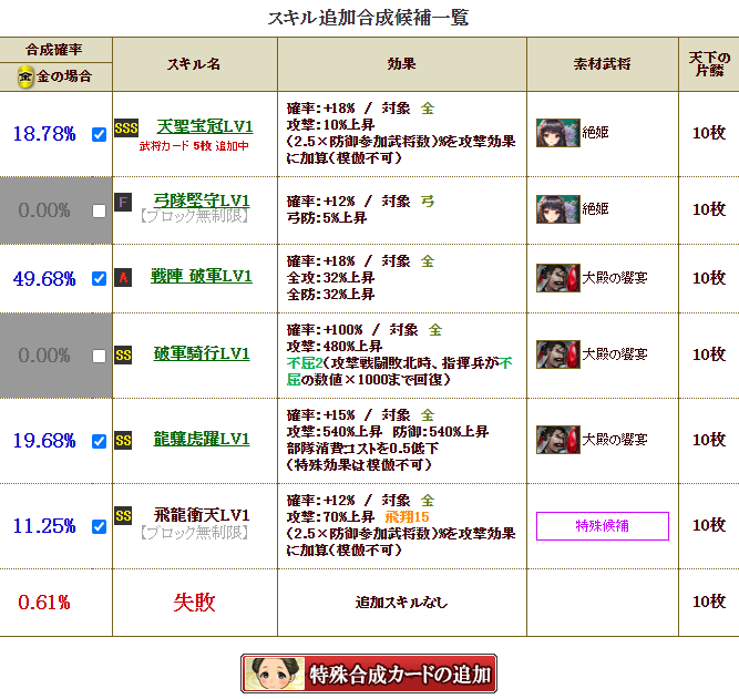 候補から戦陣破軍を消してしまうと、約50%なので失敗確率が大きくなるし、一旦これが付いてから、まだある十四周年饗宴を合成していこうかと思い、残しています