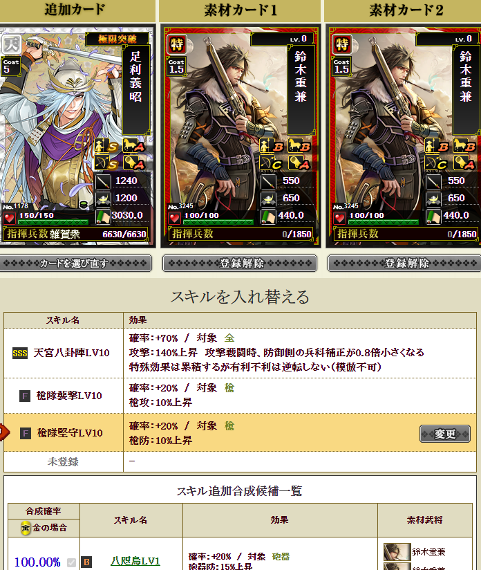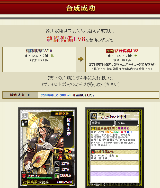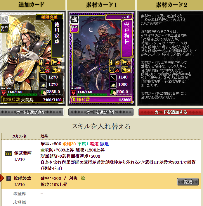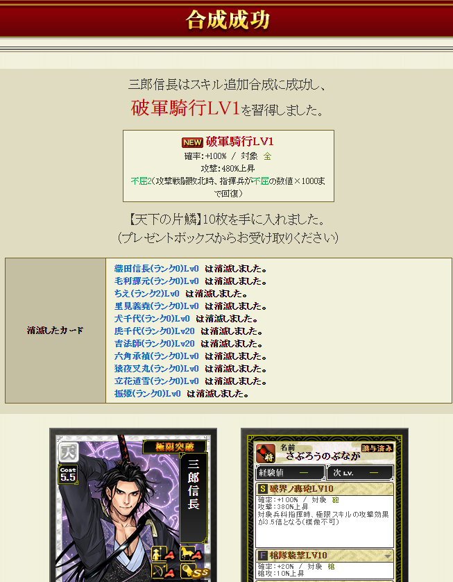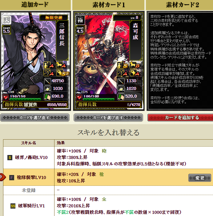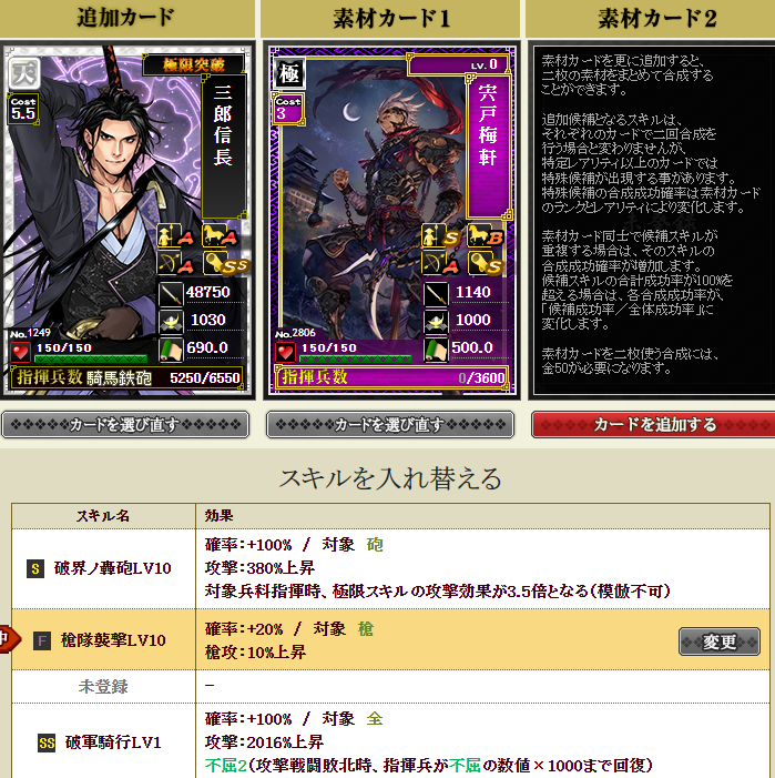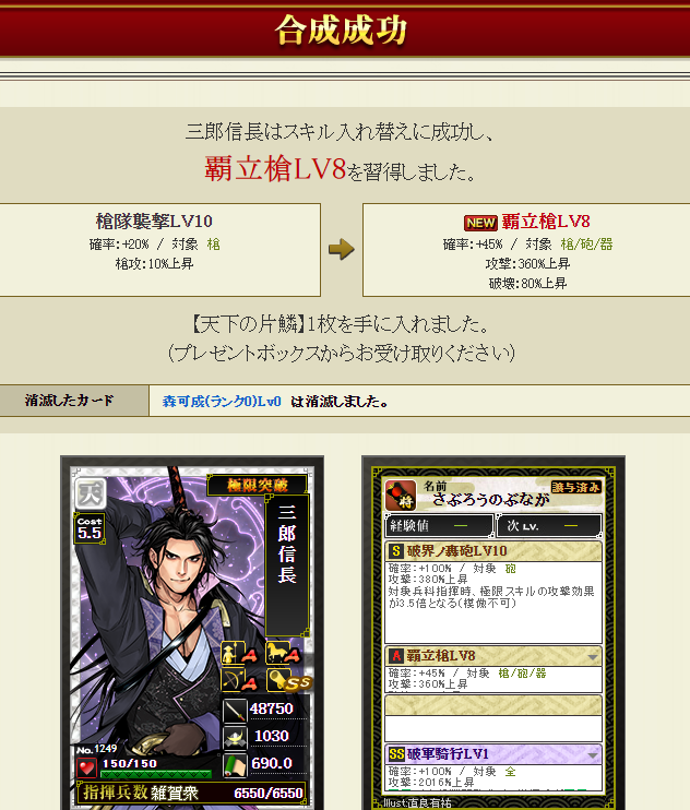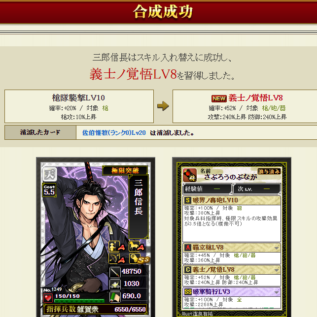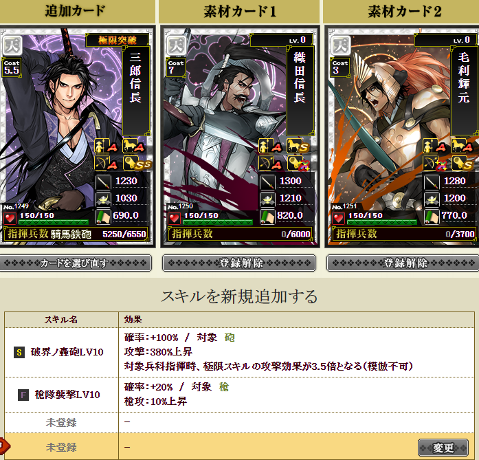 新たに部隊に加入する三郎さんはすっぴんなので、一番大事な極限枠に強いスキルを入れねば・・・で、ダブりの信長さんと毛利さんを溶かします・・・失敗約1%なので大丈夫でしょうポチっとな