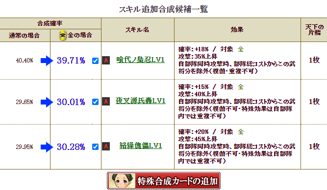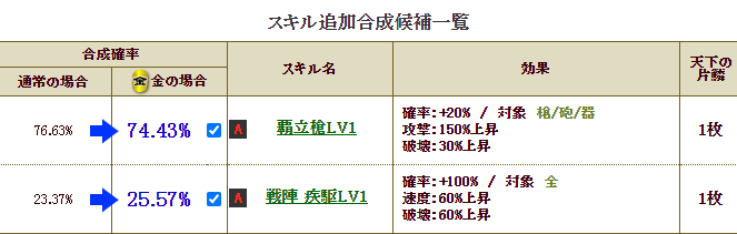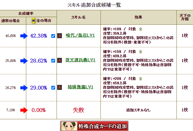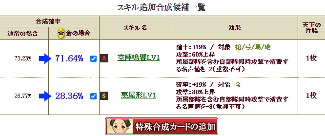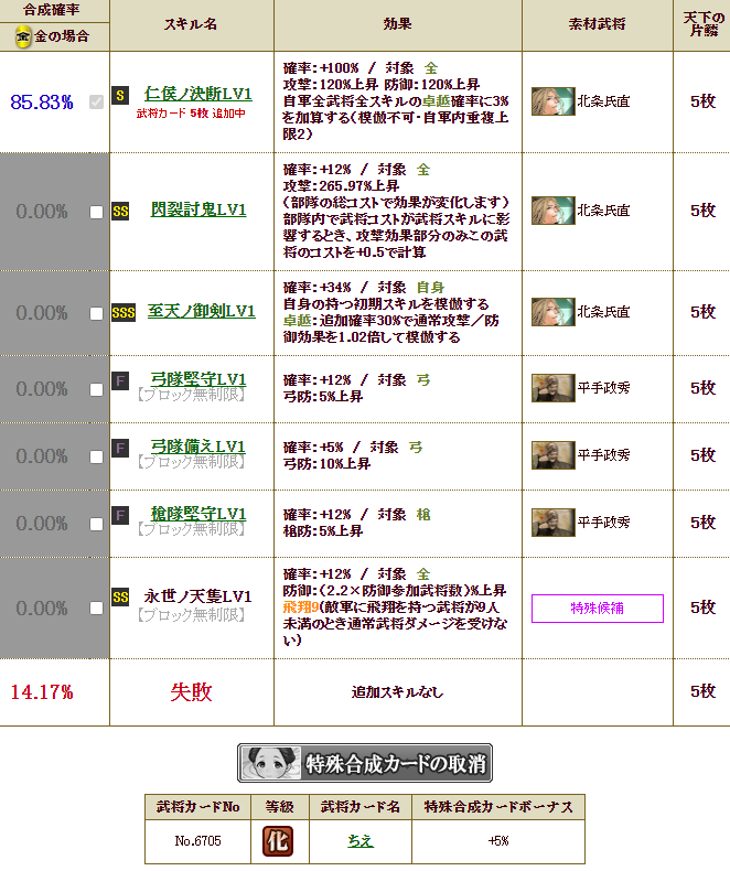 で、2枚合成なら楽ですが、せこい私は、1枚合成でいけるだろ・・・と、自軍卓越15%アップをチャレンジ