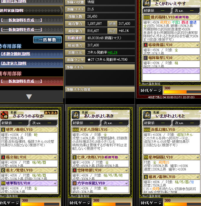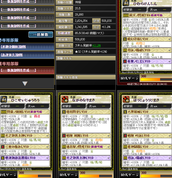 ちなみに六字が発動するかは、部隊発動率が約50%、六字が30%、4部隊目のシクレ今川さんのスキルで自軍発動率+5%・・・合計85%