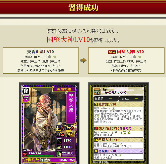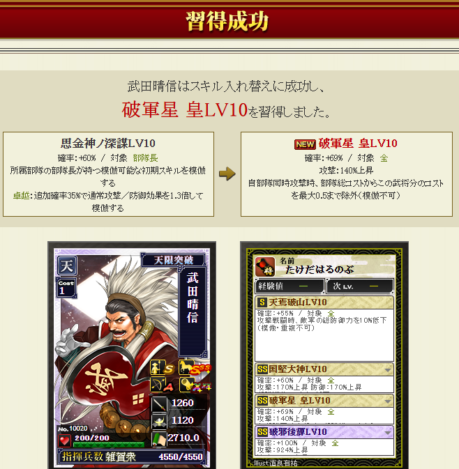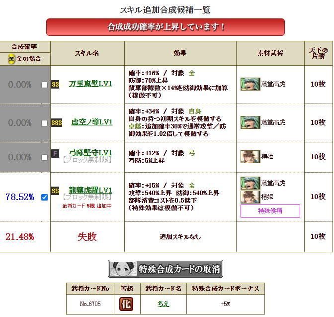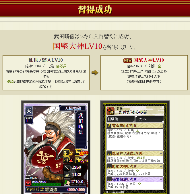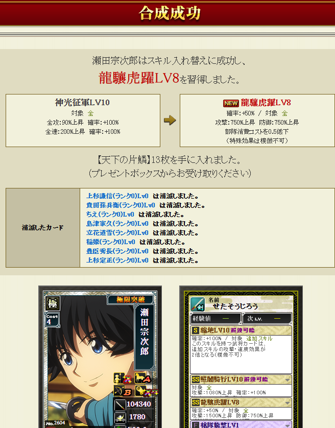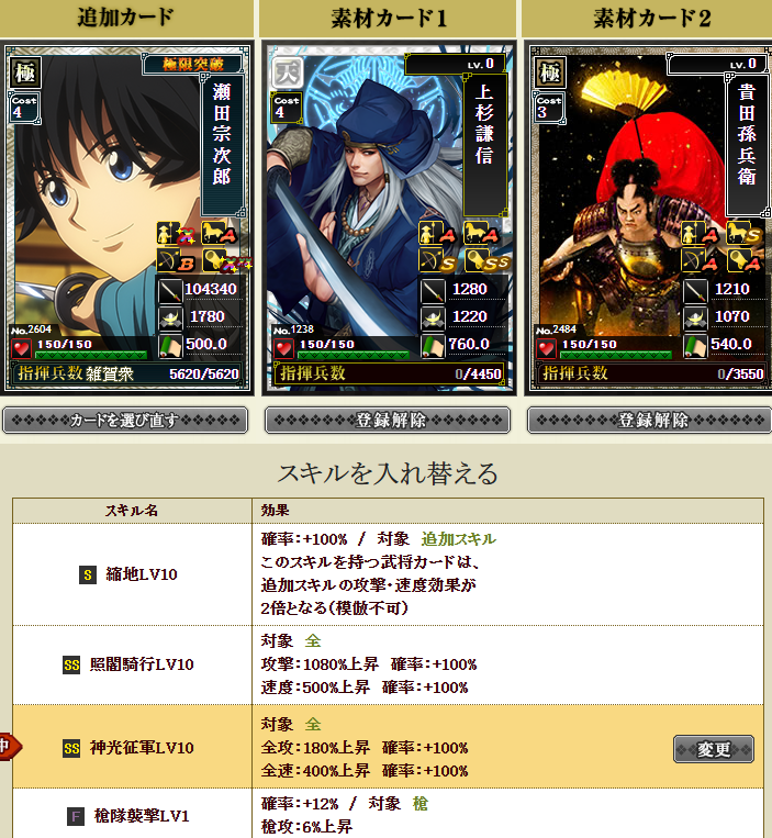 2枚引いた上杉謙信さんを1枚使い、もう1枚は星神素材で合成チャレンジ・・・そういえば全く上杉さん育てられないなあ・・・wそれは置いといて・・・