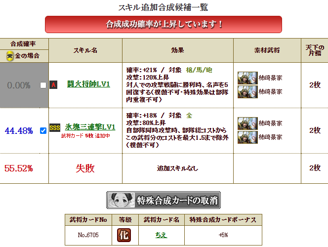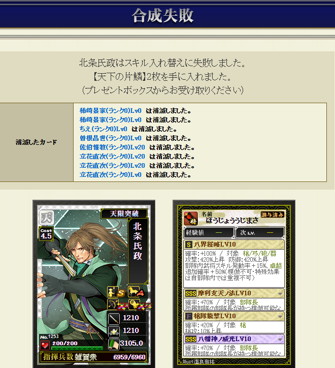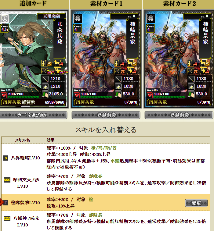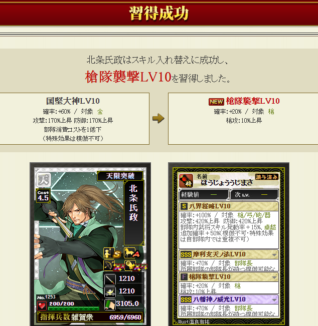 ということで、先日、北条氏政さんに国堅を付けたんですが、盟主戦では志々雄さんを使用するため、更にコストがかかる・・・コストをもっと減らしたいため(一体どれだけコストカットスキルを付けまくっているんだろう・・・w)合戦中でしたが、急遽、北条さんに付けた国堅を消し(w)、襲撃を付けて・・・