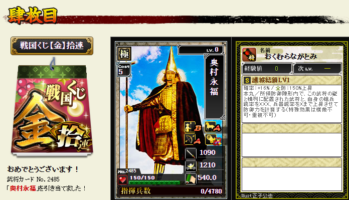 ですが、貰える銅銭は、影が13回防御に成功し120万銅銭だったのに対し、本城主は16回防御に成功し150万銅銭・・・ほぼ変わらないw