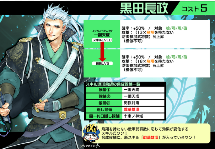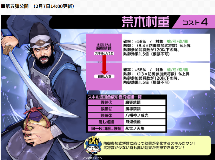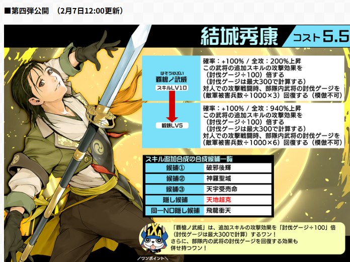 私も今回の新スキルを、間違えて弱いスキルを付けてしまった志々雄さんに付けたいのですが、この加藤さんの初期スキルでもいいかなあ~と思い始めています・・・付けやすそうだしw