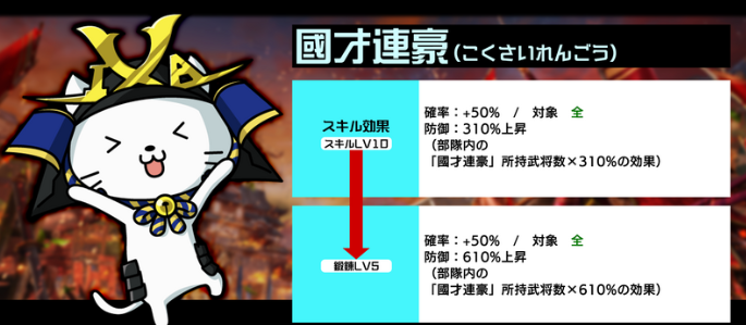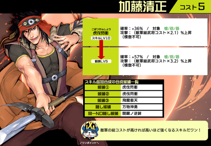 対して、加藤さんのスキルは、槍砲器で、敵軍総武将コスト×2.1%