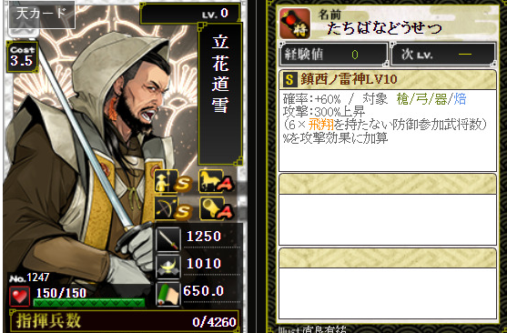 島津さんメイン防御だとして、250のうち200を火矢、50を鉄足にしたとして、神将(火矢)は200×12+150=2550%