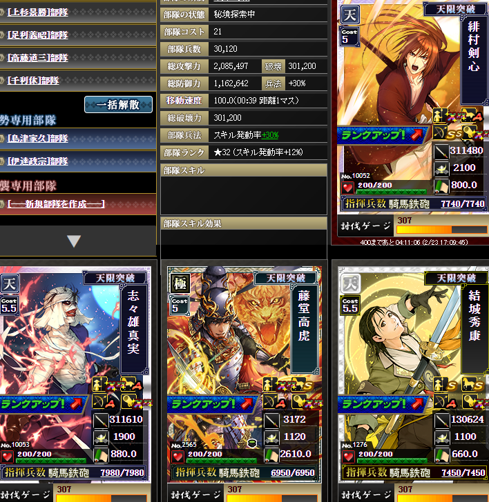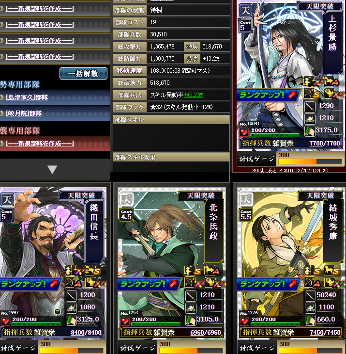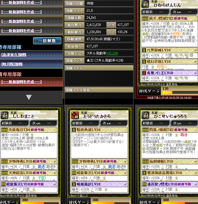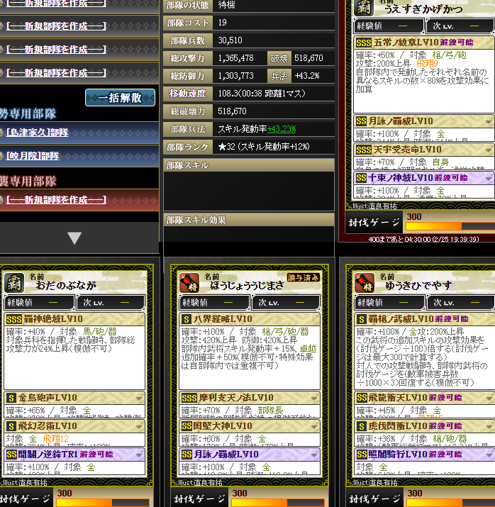 加勢の方も発動率アップを入れてくれたので、合計12%くらいは盛れてたのかな・・・それでも部隊発動率40%+巌流15%+八界15%+発動アップ12%=82%・・・うーむw