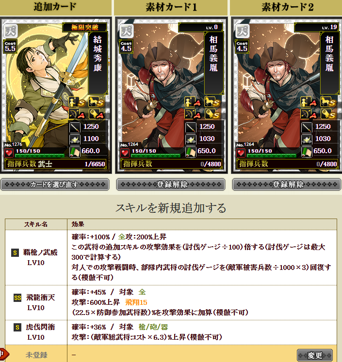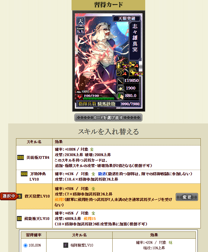 極限枠は、一体何を付けようか・・・と、放置してましたが、ふと天相馬さんが2枚あることに気づき・・・初期スキルは全だし、「この武器と同じ兵種を指揮する敵軍武将数×12.5%」・・・250名同じ兵種だったとして、3125%・・・まあそんなことは起こらないんですがw