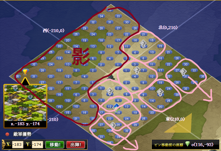 今回は、東西に分け、本影で半分ずつ取っていくことにしました~半分に分けるのは、南北でもいいのですが・・・とにかく、その方が開拓していくとき、次の支城までの距離が短縮されるかなと思って・・・陣の共有ができるようになって、このように分担してもよくなったのは楽ですね