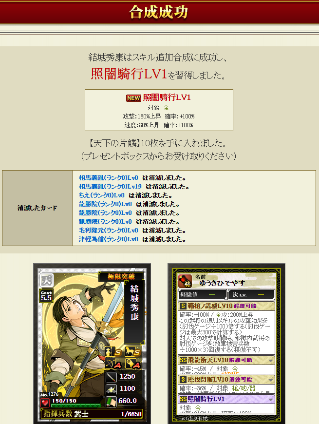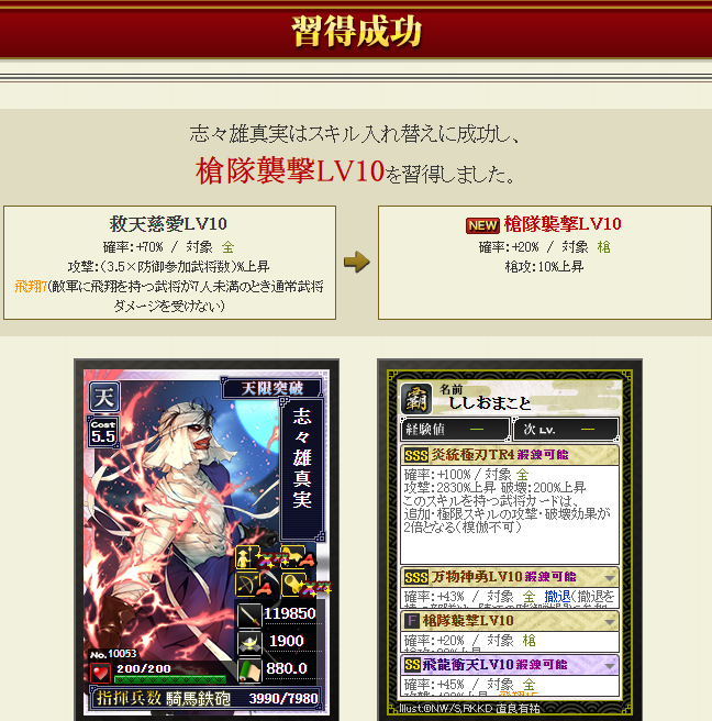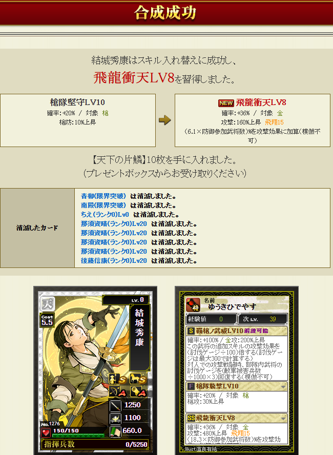 合成した後、先に極限にS2の飛龍を付けていれば、万物が通常枠に狙いやすかったなあ・・・と思いましたが、時すでに遅しw