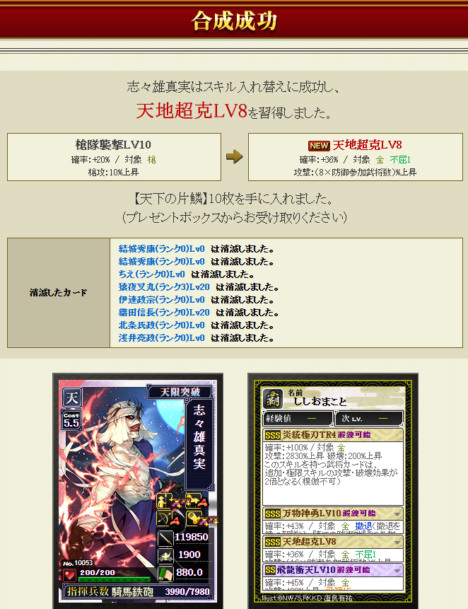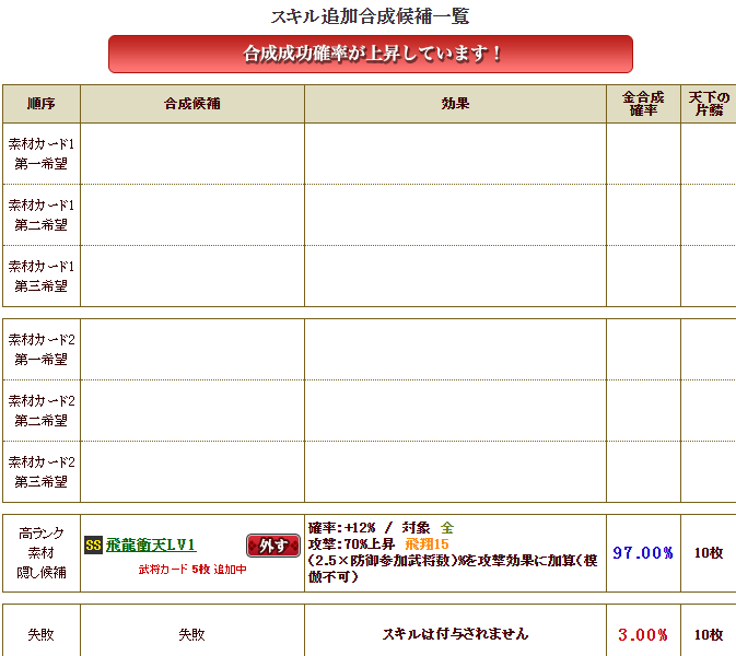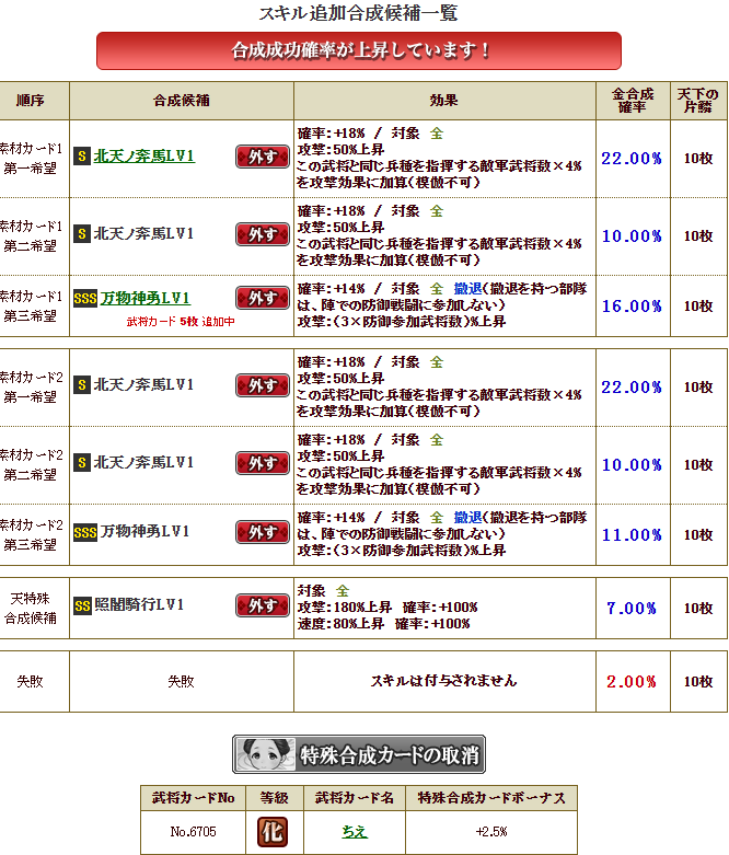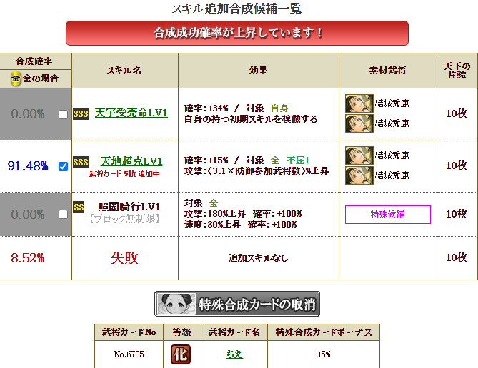 天地超克は、結城さんのS1なので、新合成だと、まず、第1~第3スキルを相手に付けておかないと、天地を第一希望には持ってこれません・・・破邪、神羅、天宇・・・付けるのが結構大変です・・・なので、旧合成でやります