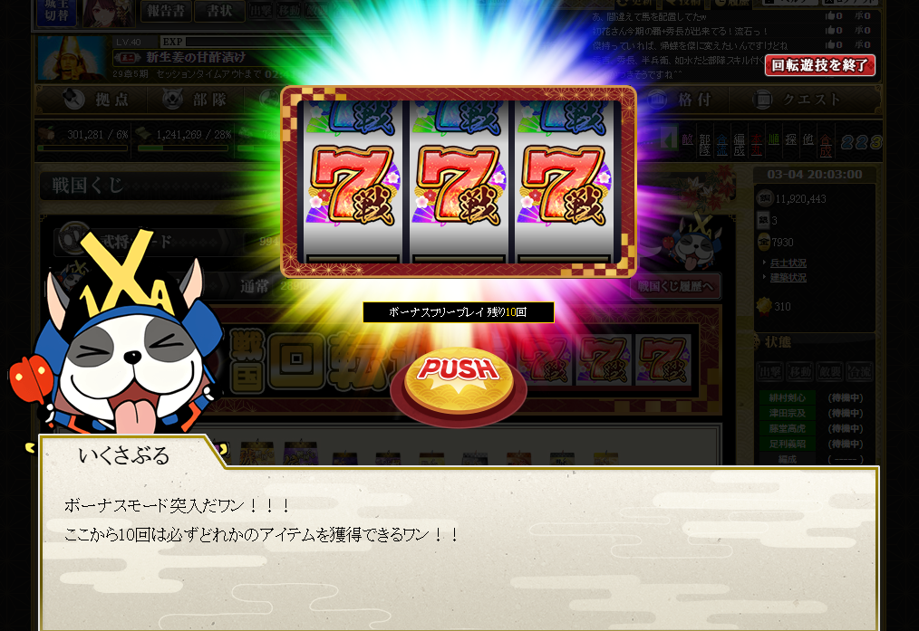 これが意外といいんですよね~金くじ10連すると70回分スロットクレジットが貰えて、スロット回せるので、70回回せば、大体赤777が一回は揃う感じなので、ちえさん等なかなかいい景品が当たる・・・