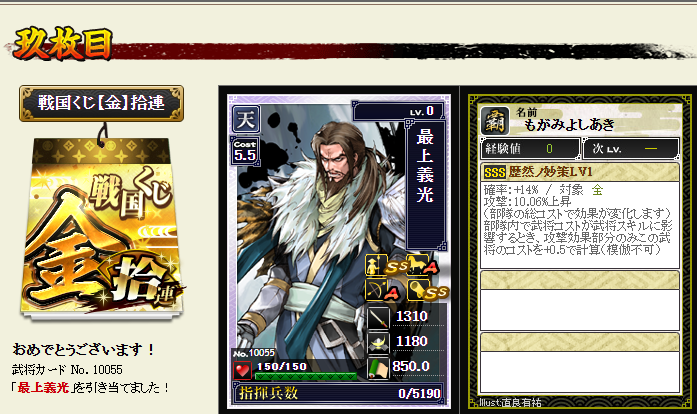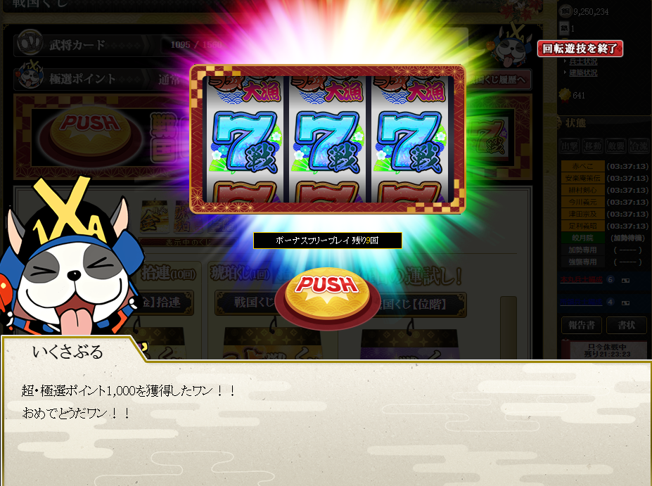 前回のスロットと合わせると、5Pたつじいも31枚貯まったので、155ポイント・・・誰かの鍛錬をしようかな・・・