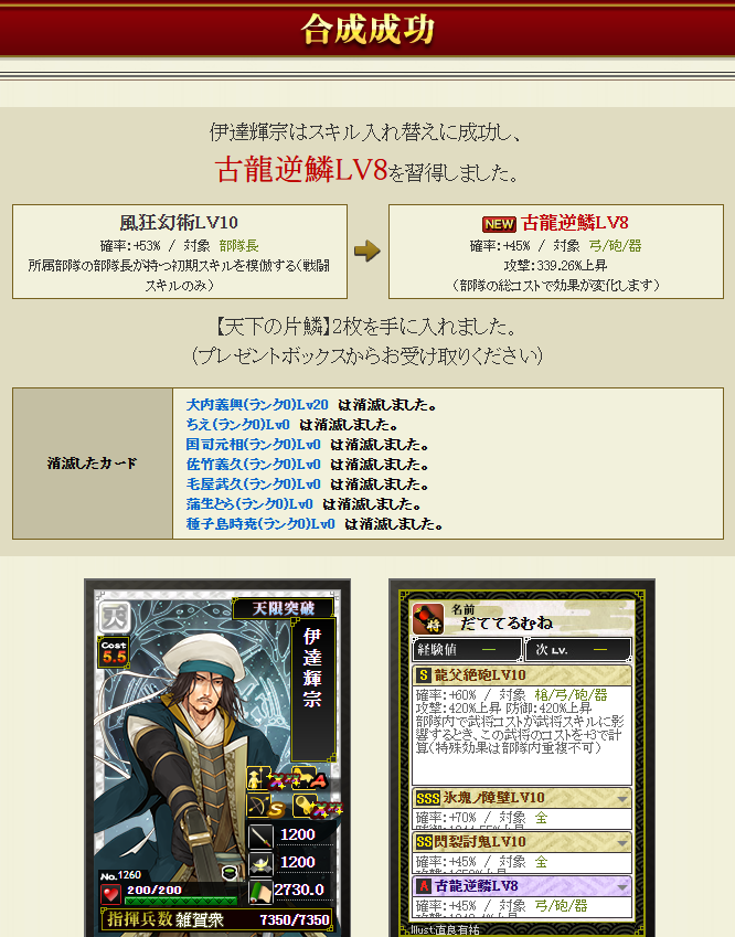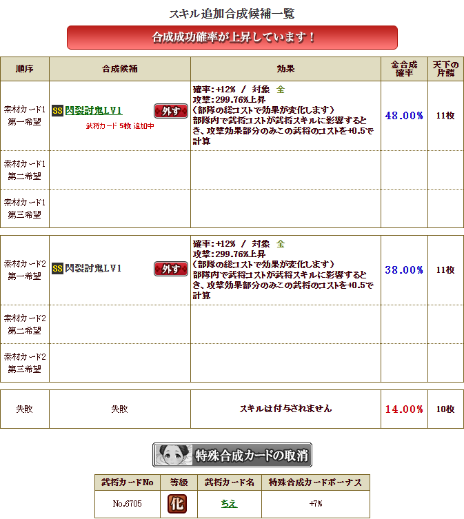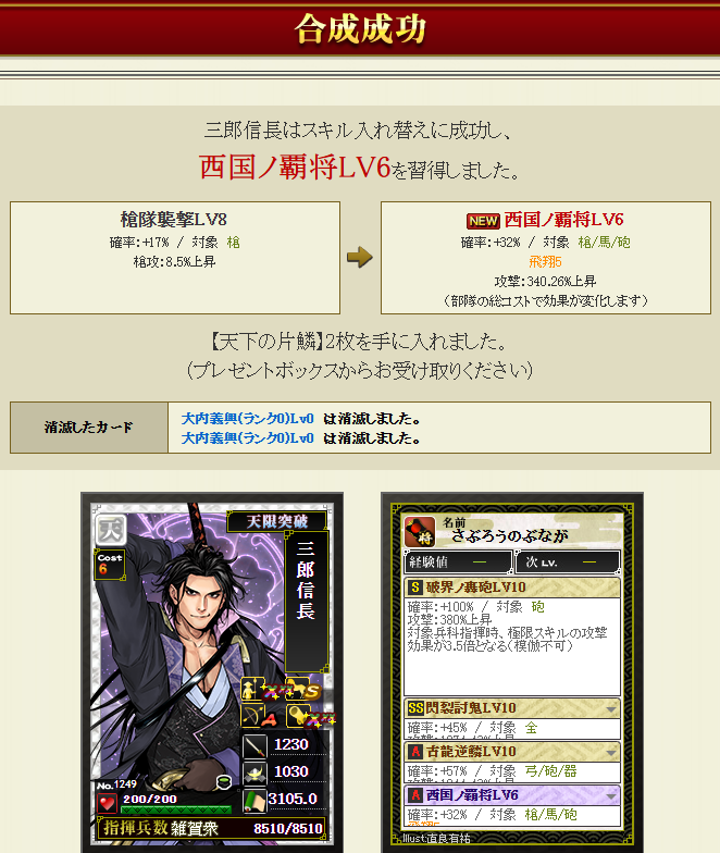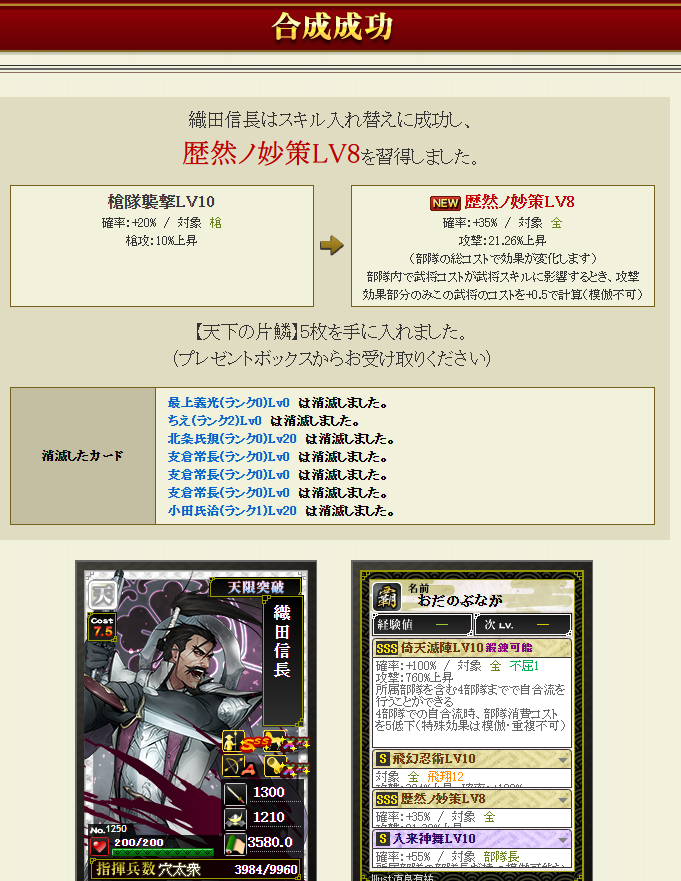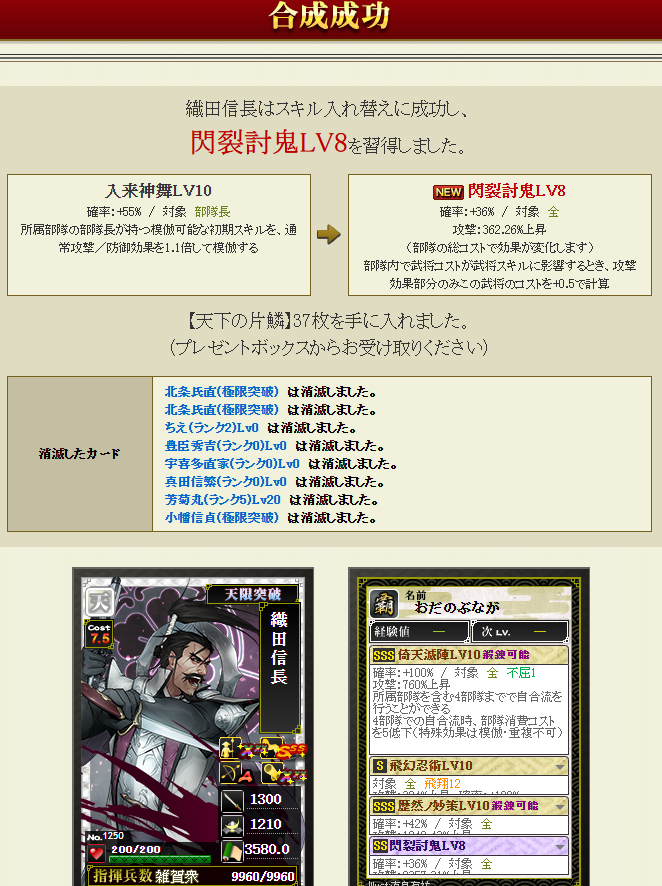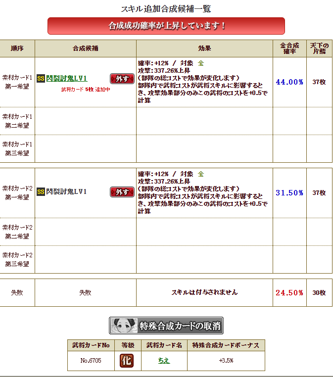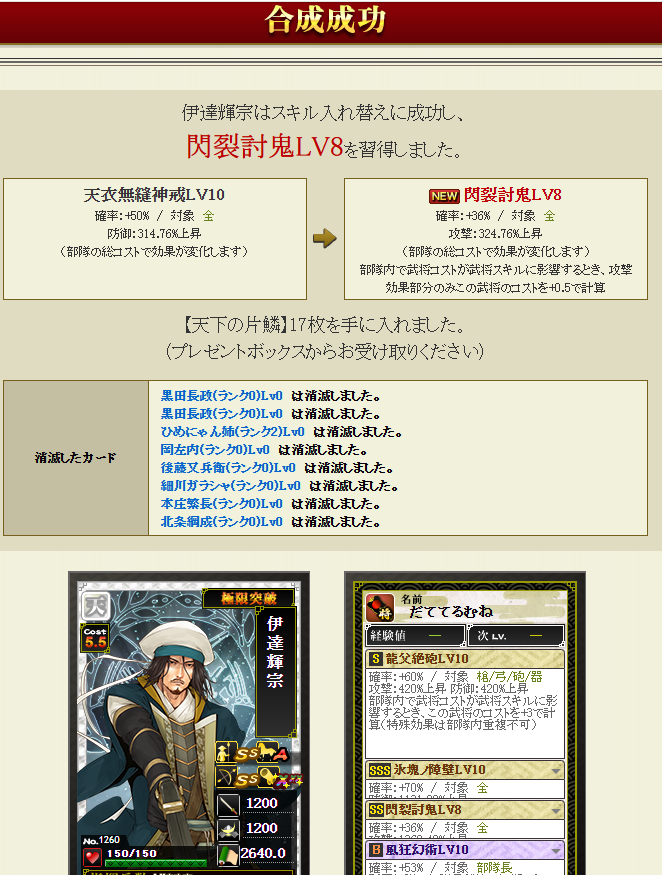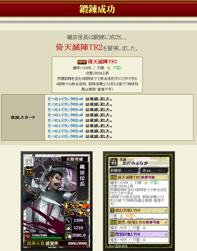 北条さんも1枚本城主で買い、1枚影で持ってたのに気づき譲与・・・極限に閃裂付けるんですが、きつい・・・天3・童2を生贄にして、★2ちえさん投入しても失敗24%・・・