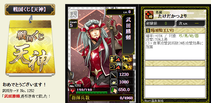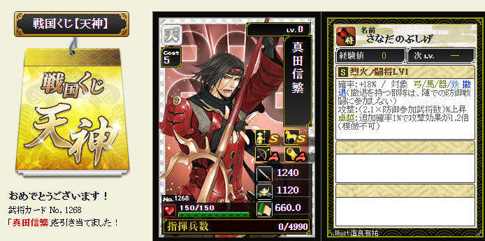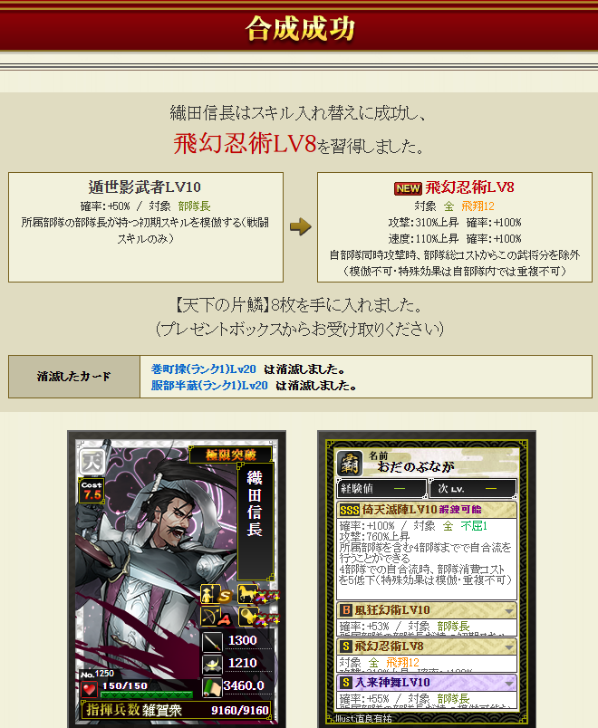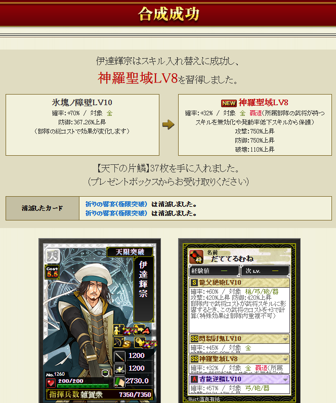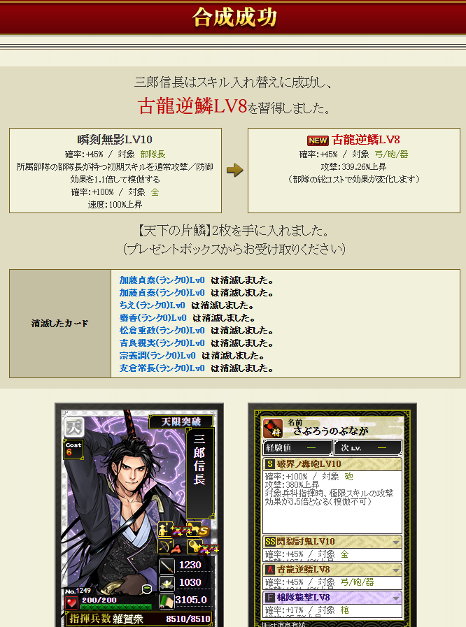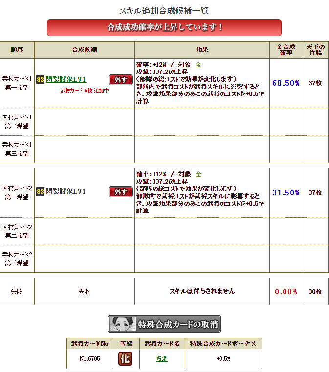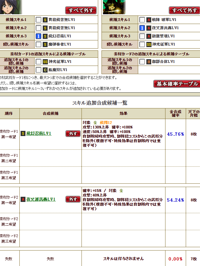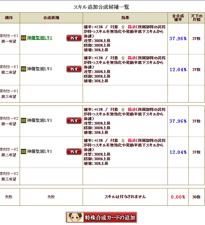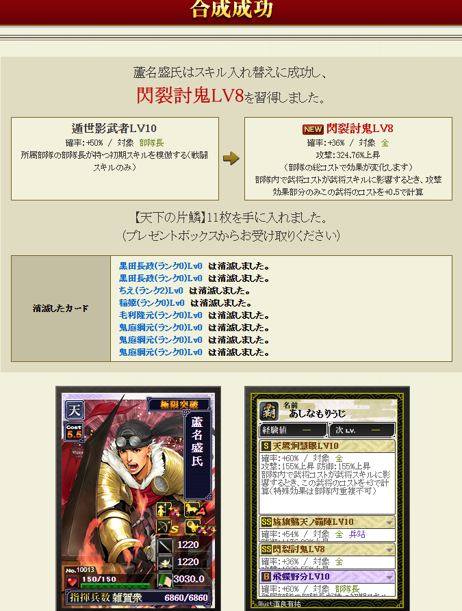 北条さんも1枚本城主で買い、1枚影で持ってたのに気づき譲与・・・極限に閃裂付けるんですが、きつい・・・天3・童2を生贄にして、★2ちえさん投入しても失敗24%・・・