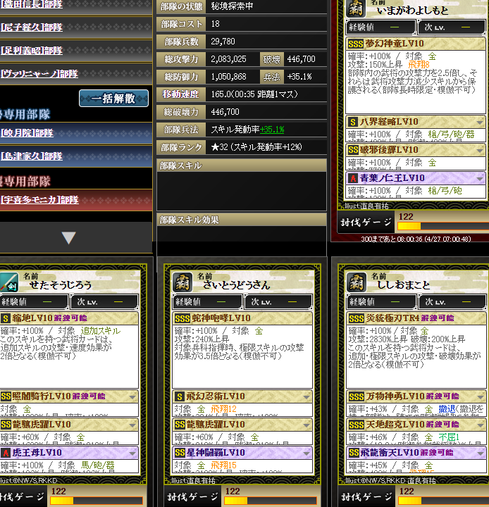 ほぼ放置状態のこの部隊でしたが、いよいよ攻撃力10億のソロ4合流ではなかなか落とせない城が増えてきたような気がしまして・・・攻撃部隊に作り替えることにしました
