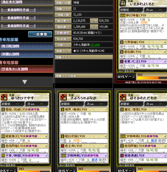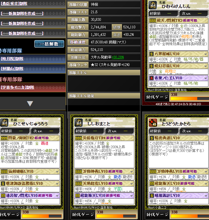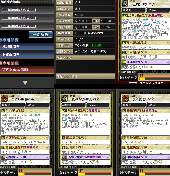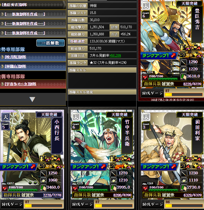 全てを同じ合流に乗せる場合は、そのまま無尽部隊を入れようとすると、3合流では乗れませんので、4合流を可能にする武将前田さんを入れてます・・・初期スキルは当然死にますが、これでも3億くらいは火力出ます