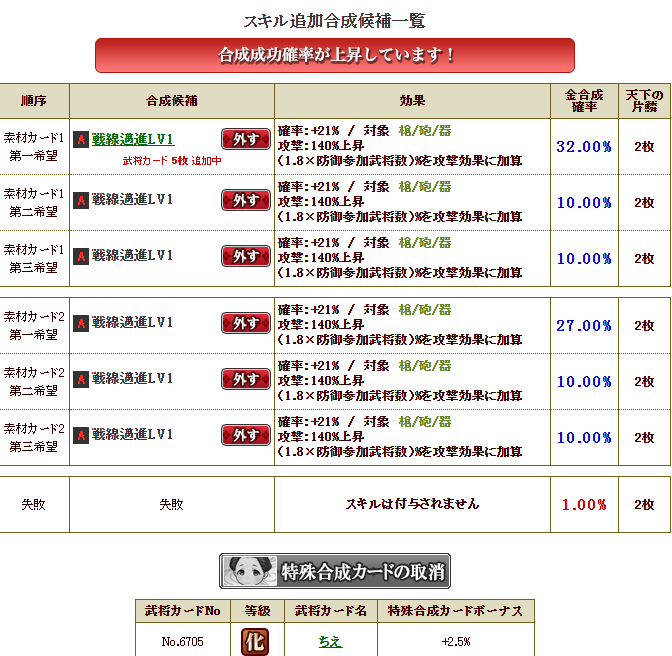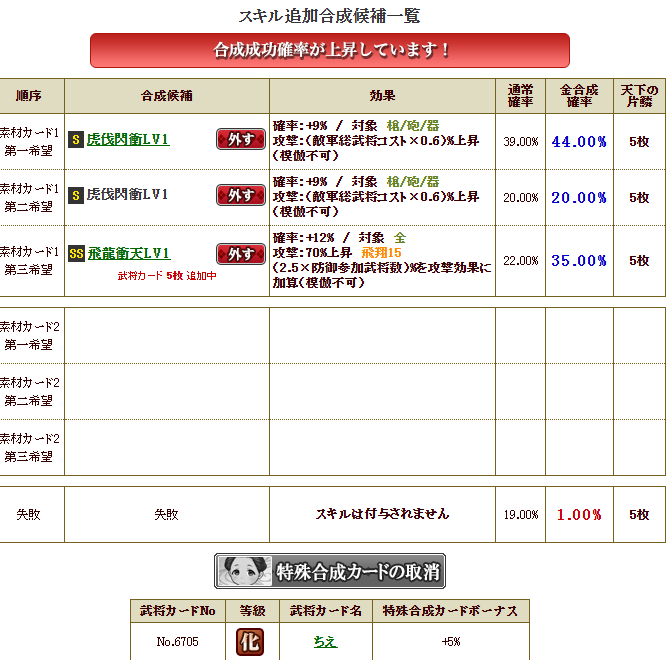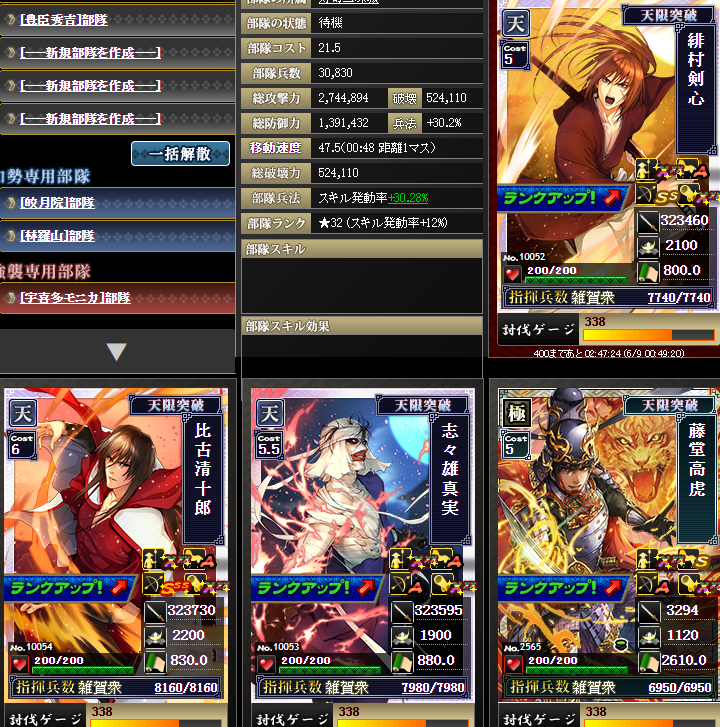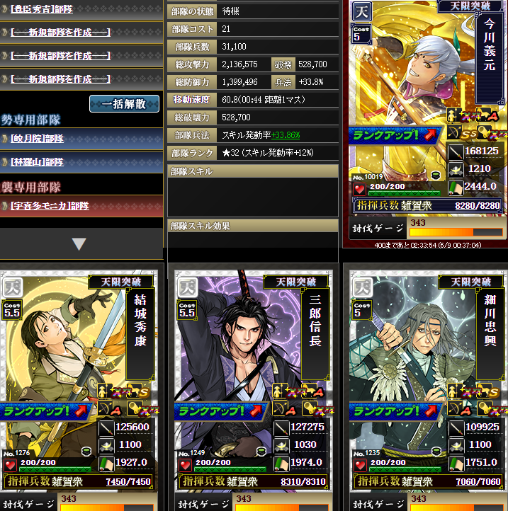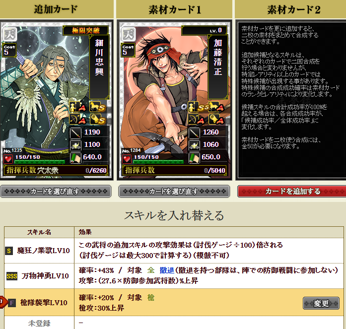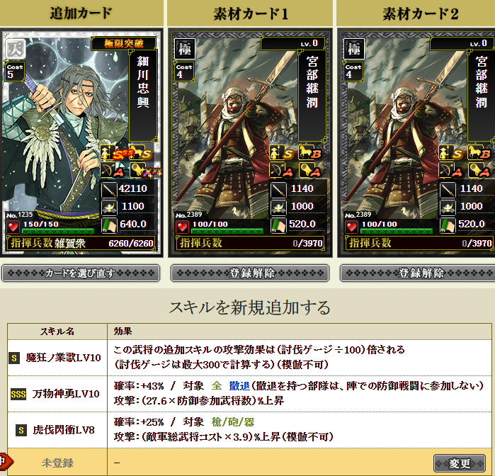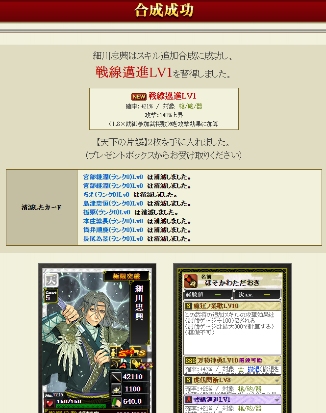 盟主戦用部隊に入れようと思いつつ、育成がストップしていた細川さんにやっと合成・・・幻イベント開始時に、一気に引いた天戦だったか天上だったか、どこからか降臨した加藤さんを素材に・・・
