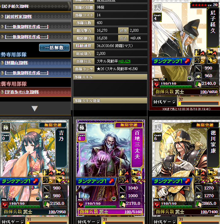 相手兵士被害アップの尼子さんマネ部隊・・・兵士被害軽減の代わりに、家康さんを入れ、すぐに復帰できるようにしてます