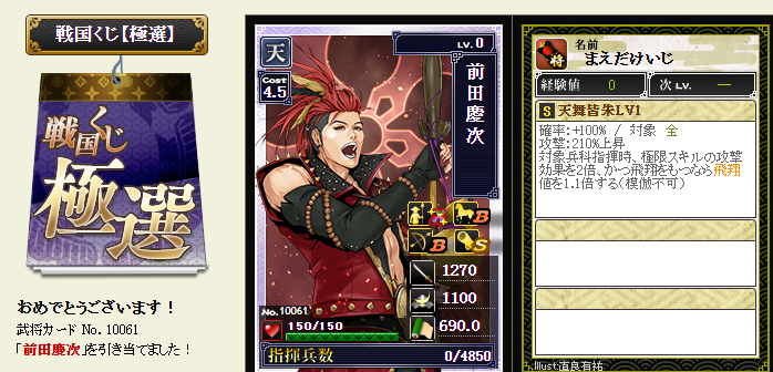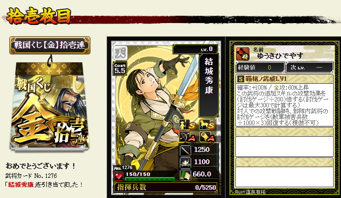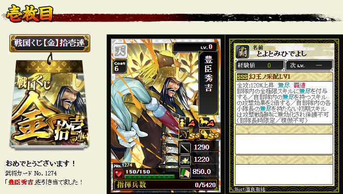 結構天様が降臨してくれました~覇秀吉さんは、2枚目なので感動が薄い・・・鍛錬素材にすべきか、盟主戦用・・・は、さすがに育成がしんどいですね・・・