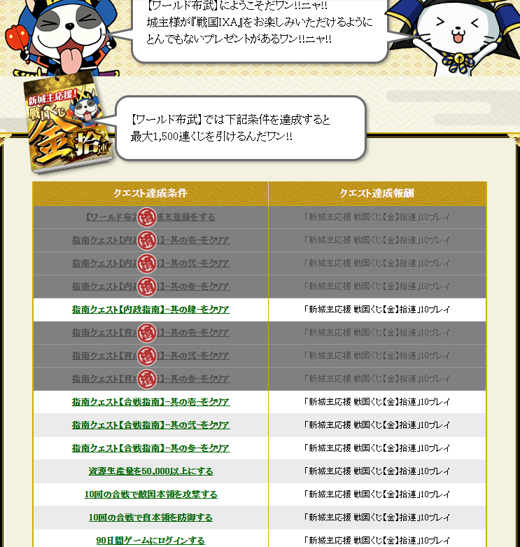 各クエストをクリアするごとに、金くじ10連×10回=100連引けます