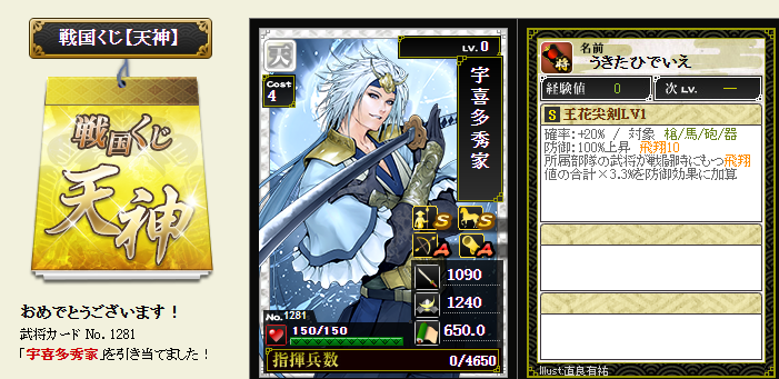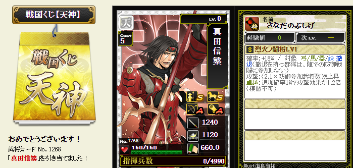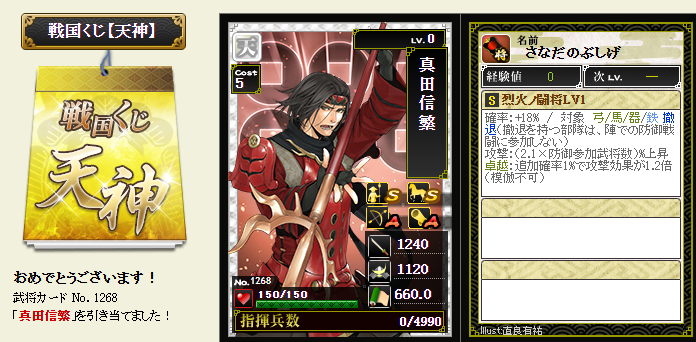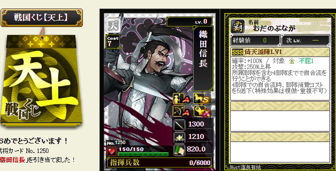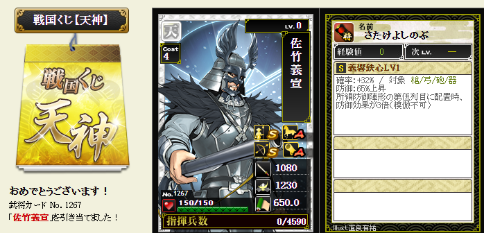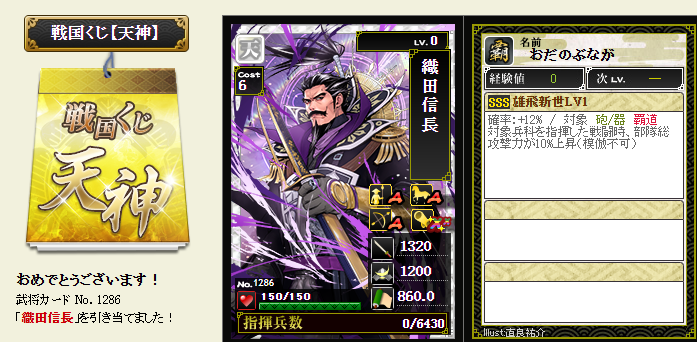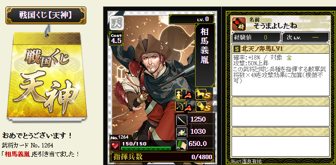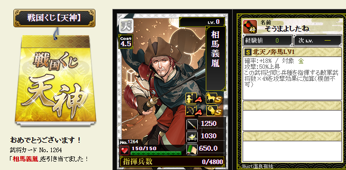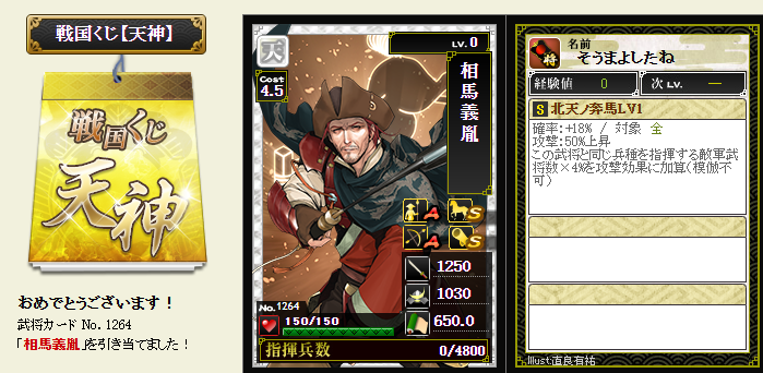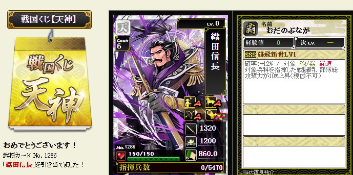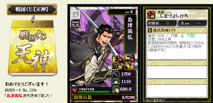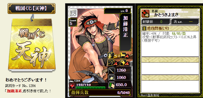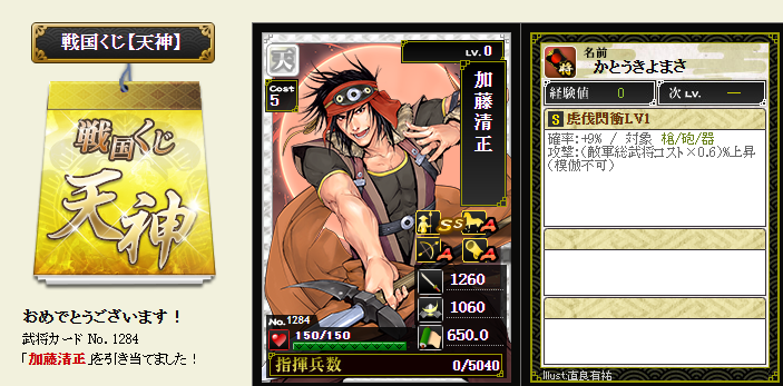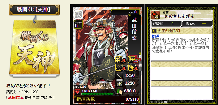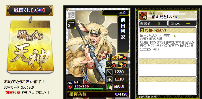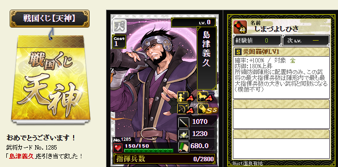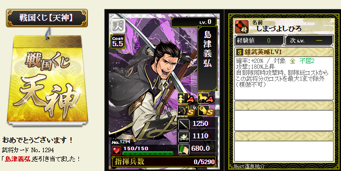 今期は一番欲しい武将が本影両方とも引けてラッキーです