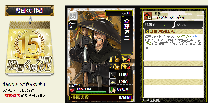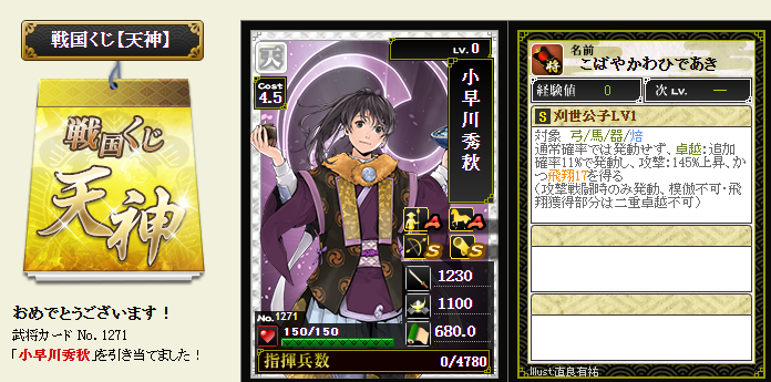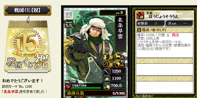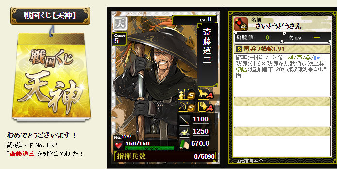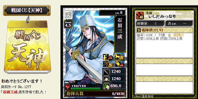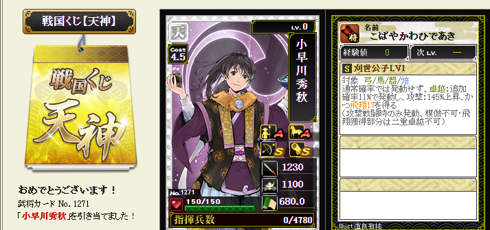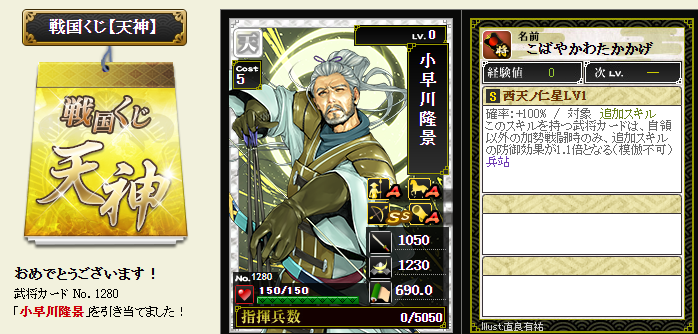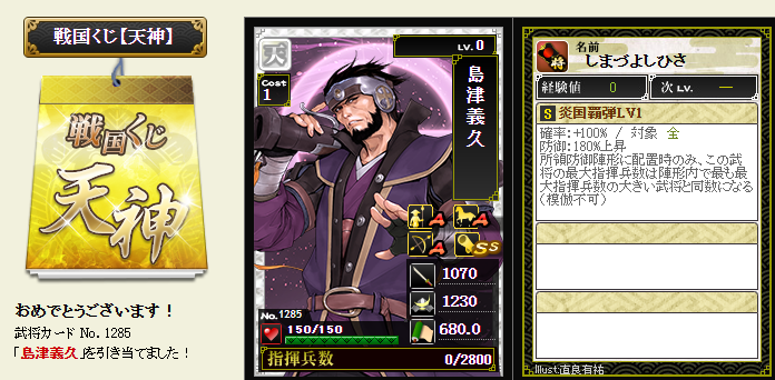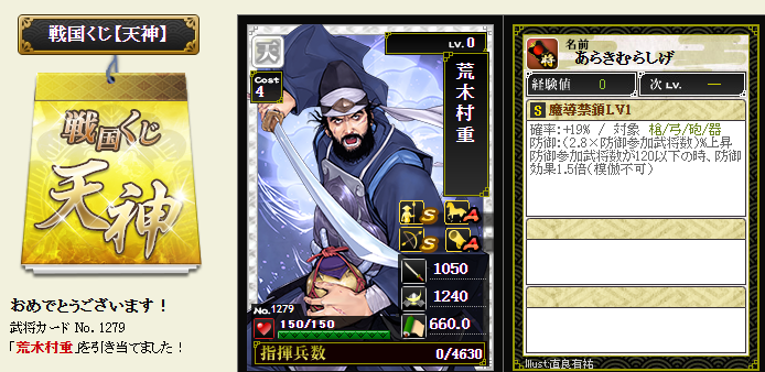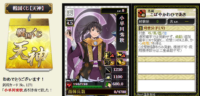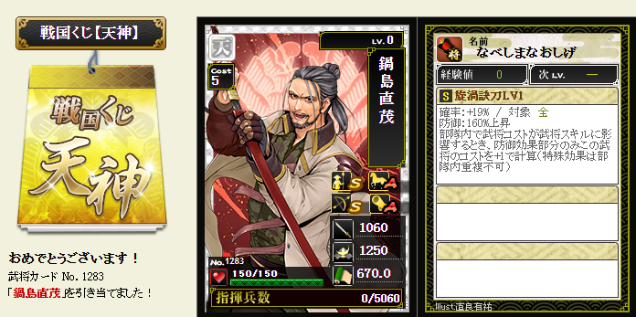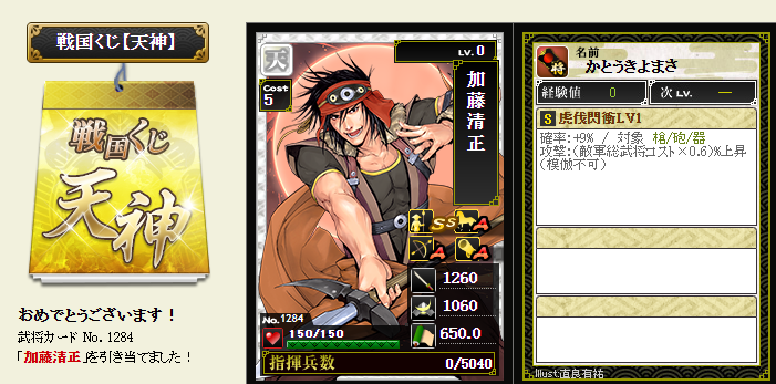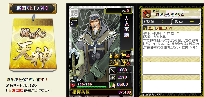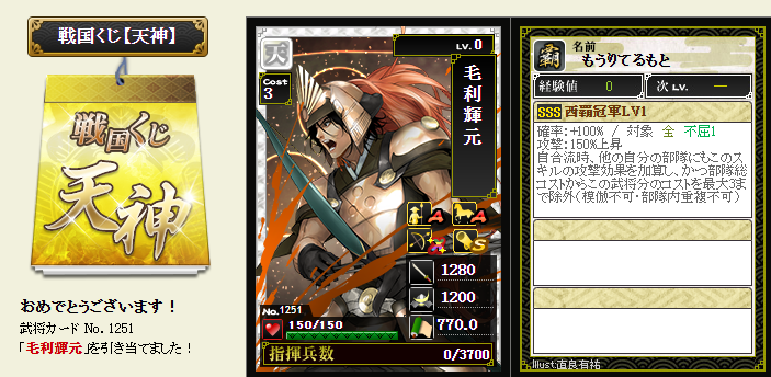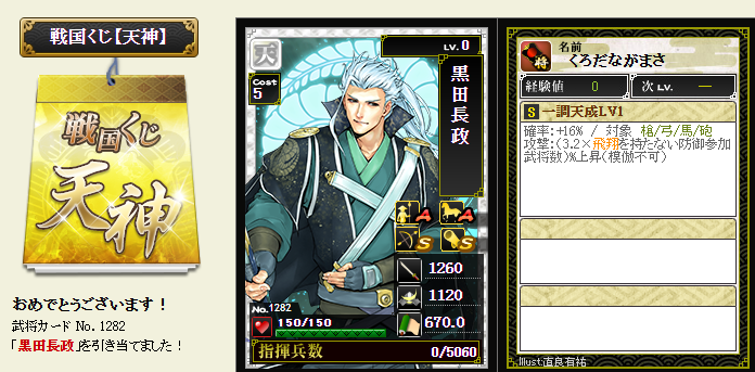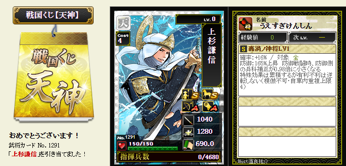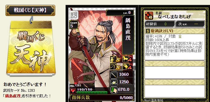 今期は一番欲しい武将が本影両方とも引けてラッキーです