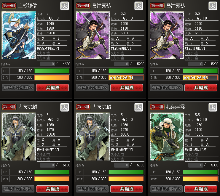 後は話題の上杉さんと、島津さん2枚・・・は素材かな・・・初期スキルは移植できて、4合信長さんと似てるけど、鍛錬していかないと「この武将分のコストを最大3まで除外」からスタートなので、4合信長さんと同じってわけにはいかない・・・