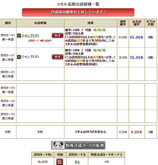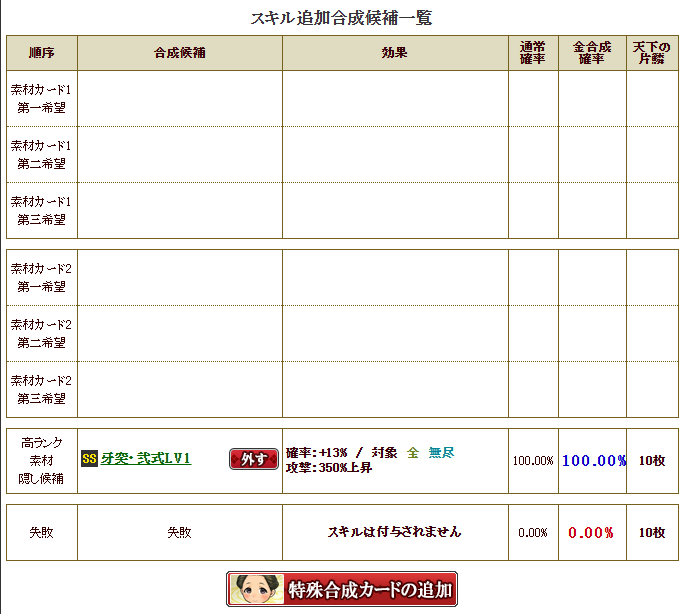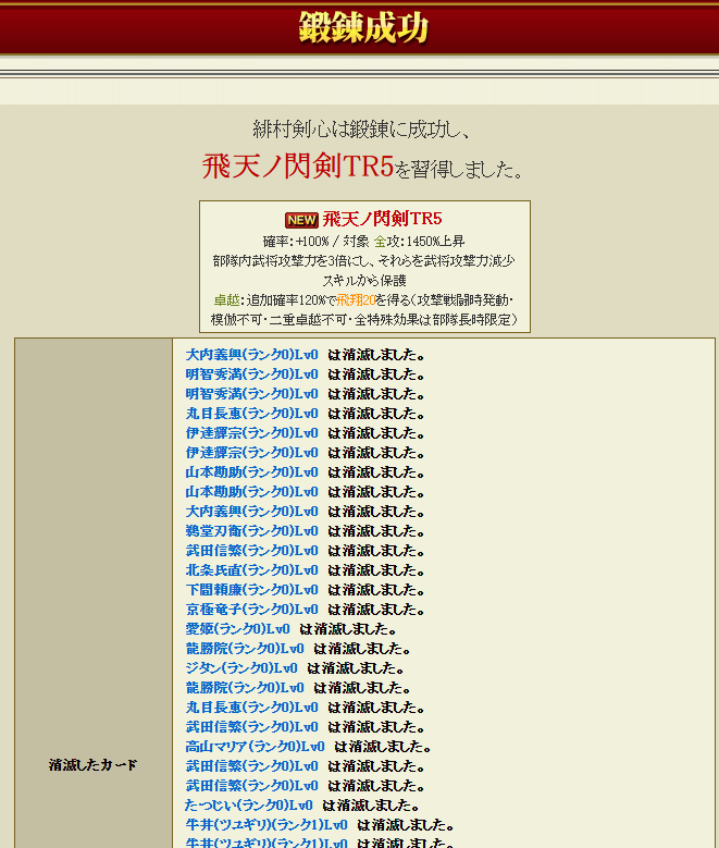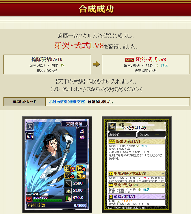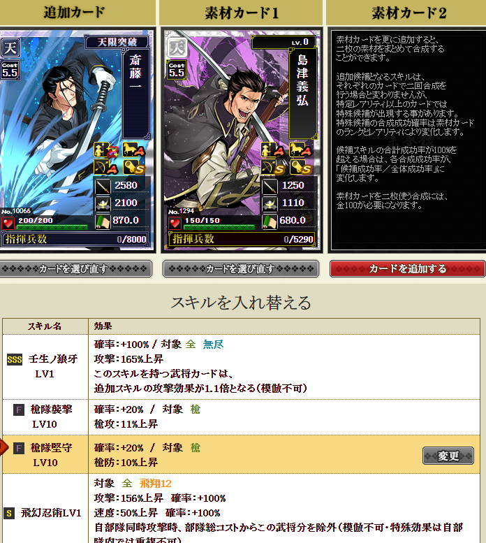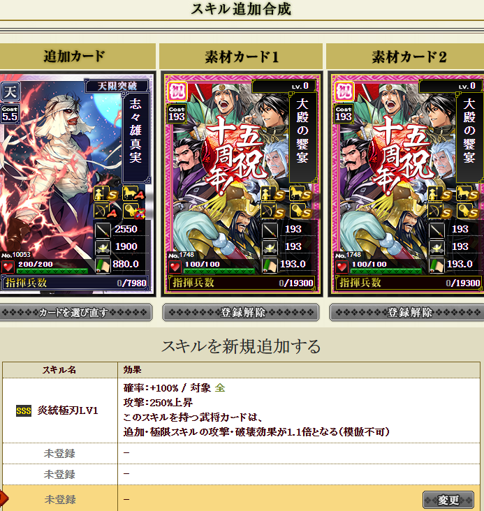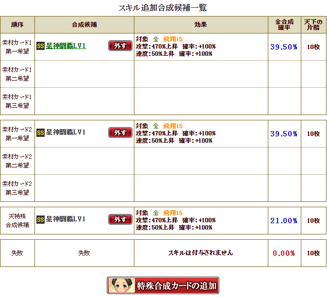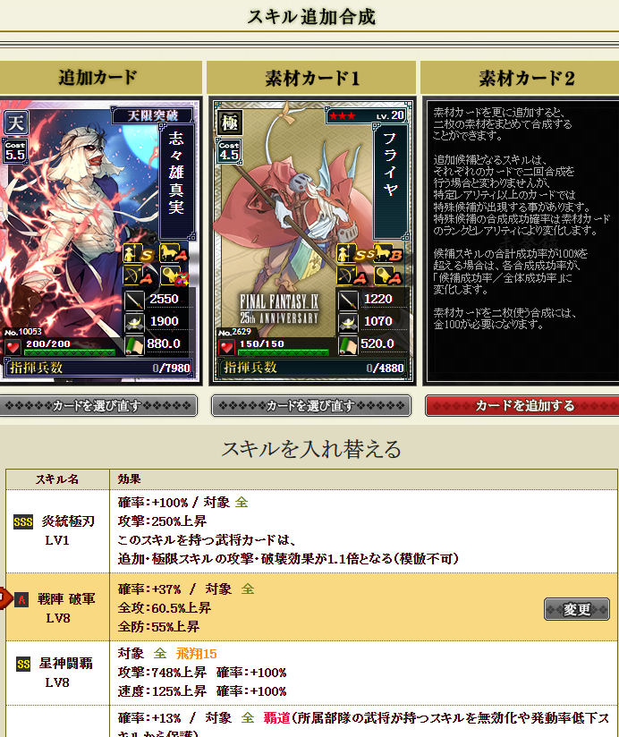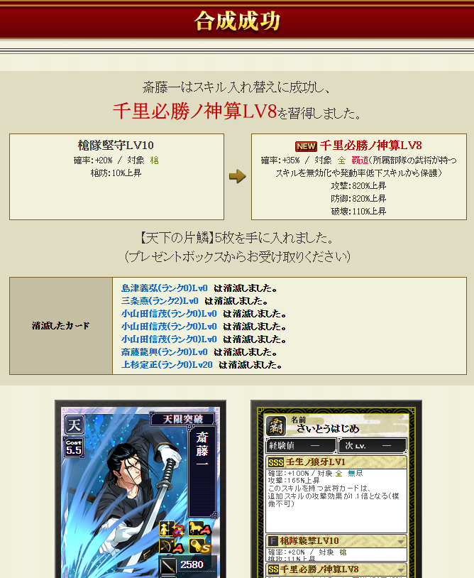 ここで、どうしても撤退付きのコスト踏み倒しスキルである「影王絶技」を付けたい衝動にかられ・・・素材が1枚しかないのがつらいところですが、保険の飛幻忍術も入れて、生贄天様大量投入、キン肉マンコラボで貰えた生贄も投入・・・かなり贅沢な合成となってしまいました・・・
