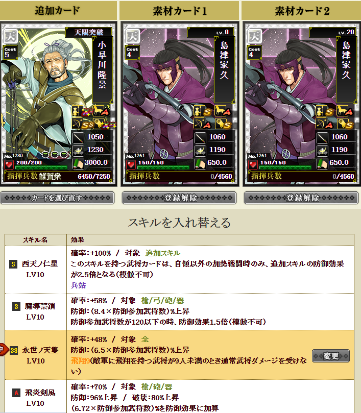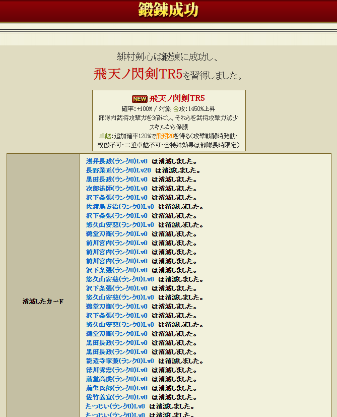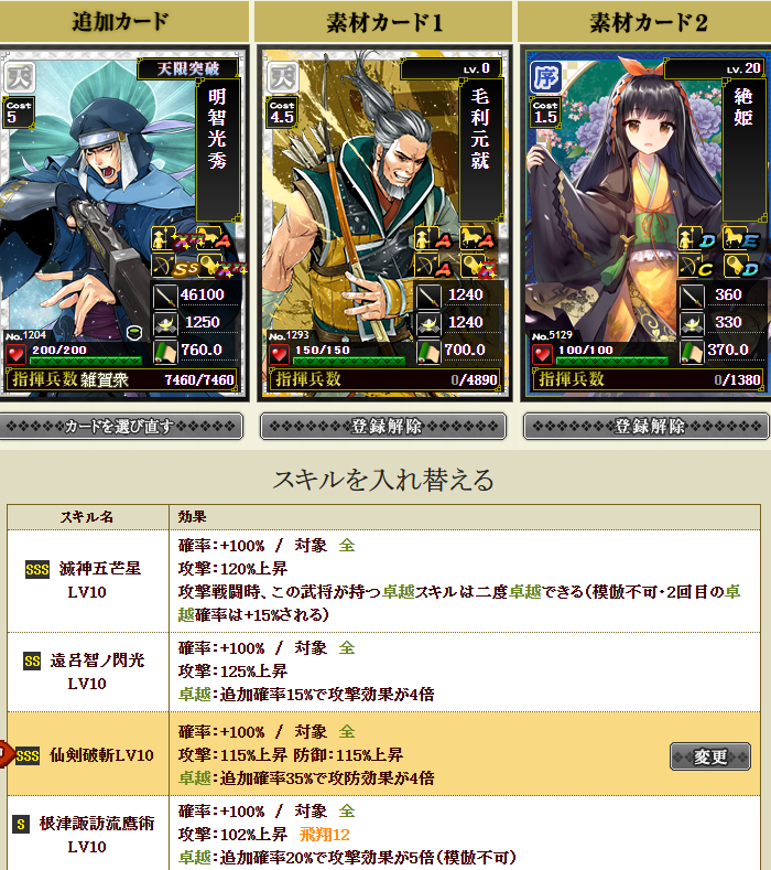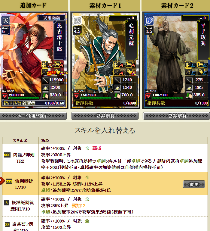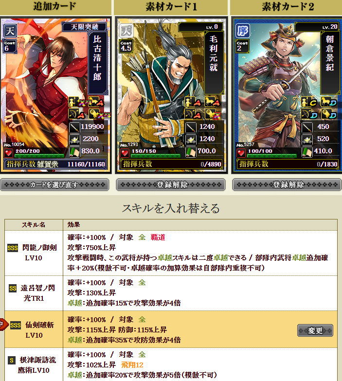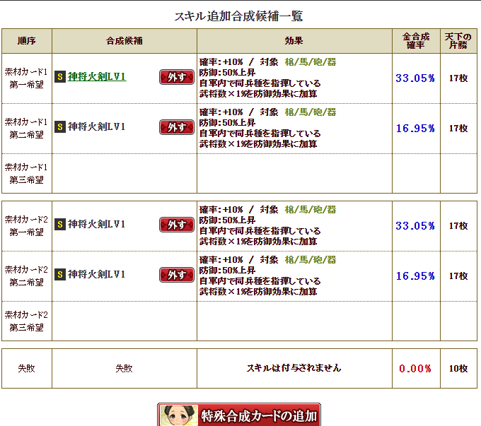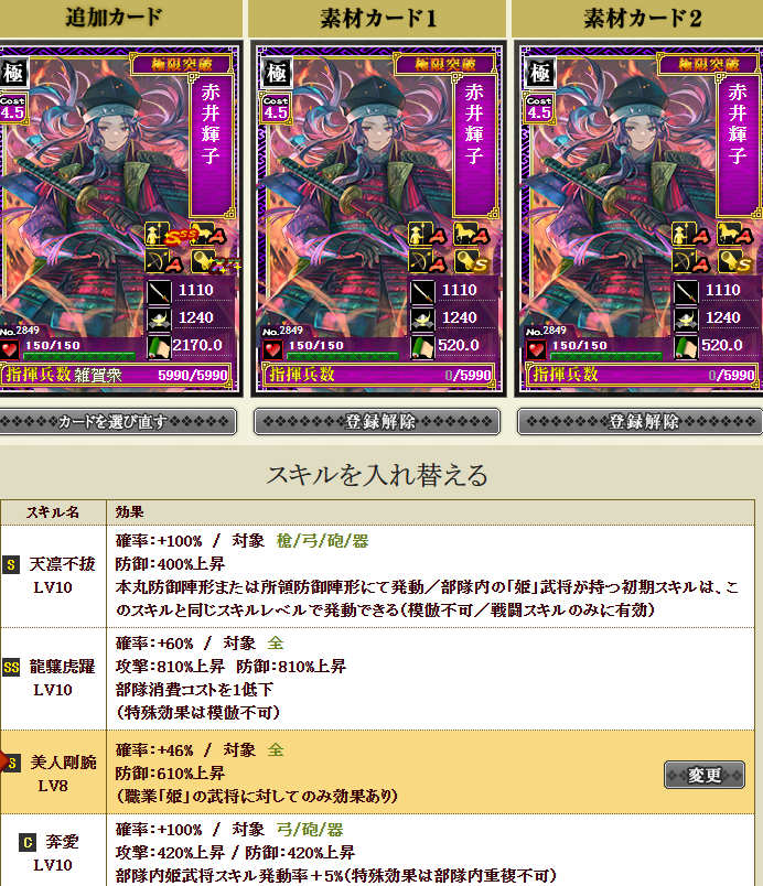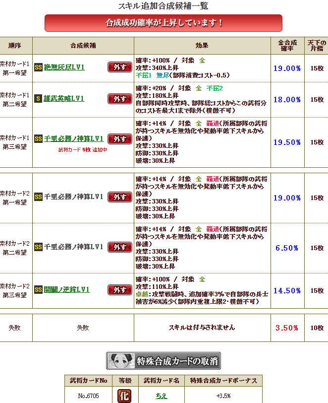 私は鍛錬5にしてみたかったですが、到底無理だなーと思い、舞姫武神という、部隊スキルの発動率が上がるという面白スキルを同一合成で付けてみることにしました