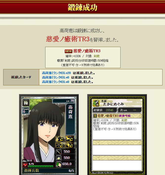 高荷さんが3枚あったので、ポイント90・・・生贄にして鍛錬3へ
