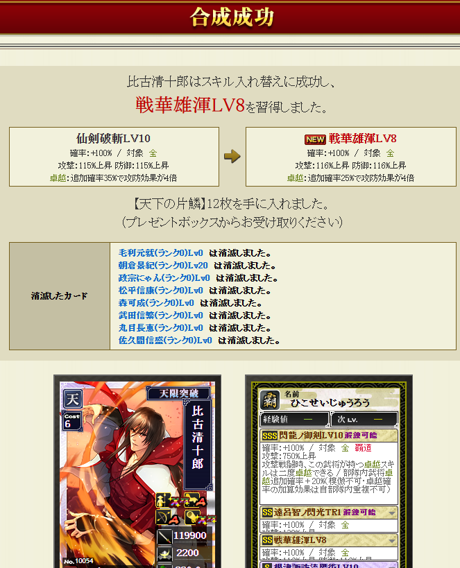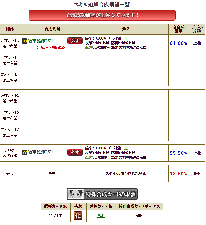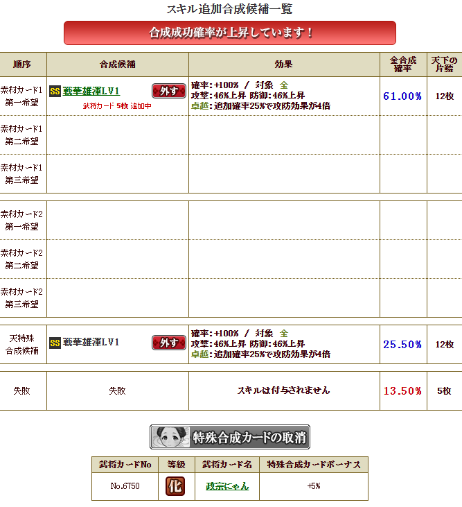 影に続き、本城主でも、全く同じ戦華合成・・・失敗確率も13.5%・・・こんなもんはああああ・・・・こう!!!