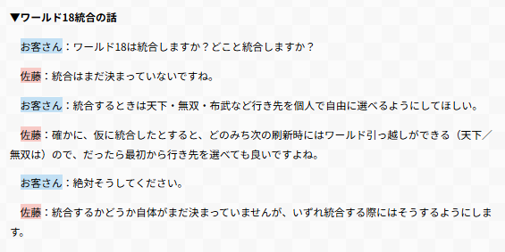 可能性として、来期統合するかどうか全く決まってないと言ってますが、①統合する場合は、18鯖は3つのワールドと選択統合できるということ