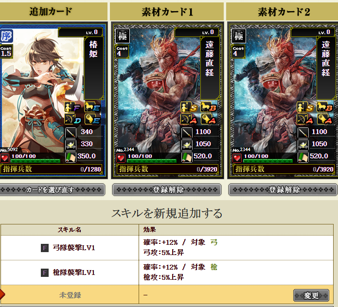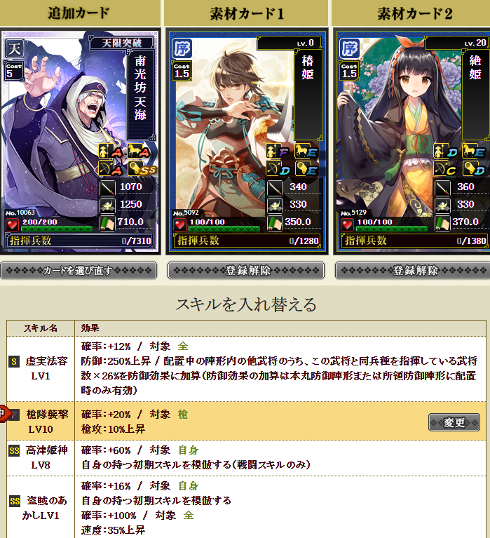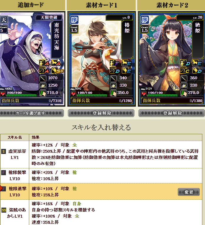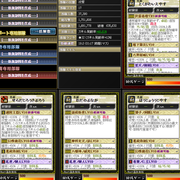 部隊構成はこちら、秀吉さんの初期スキルは鍛錬5です