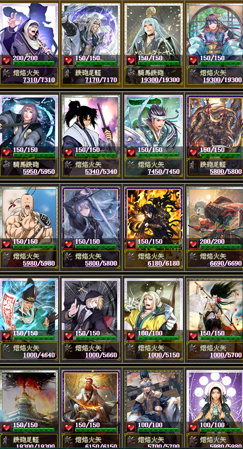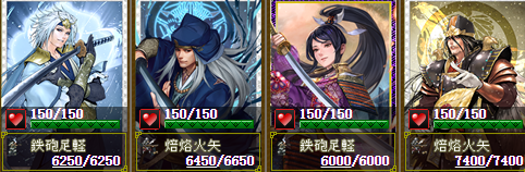 それぞれの部隊も、できるだけバランス部隊にしましたが、どうでもいい尼子さん部隊は全員火矢(兵数小w)、ラーメンマン部隊はオール火矢、難攻不落部隊も、火矢多めの編成にしてみました